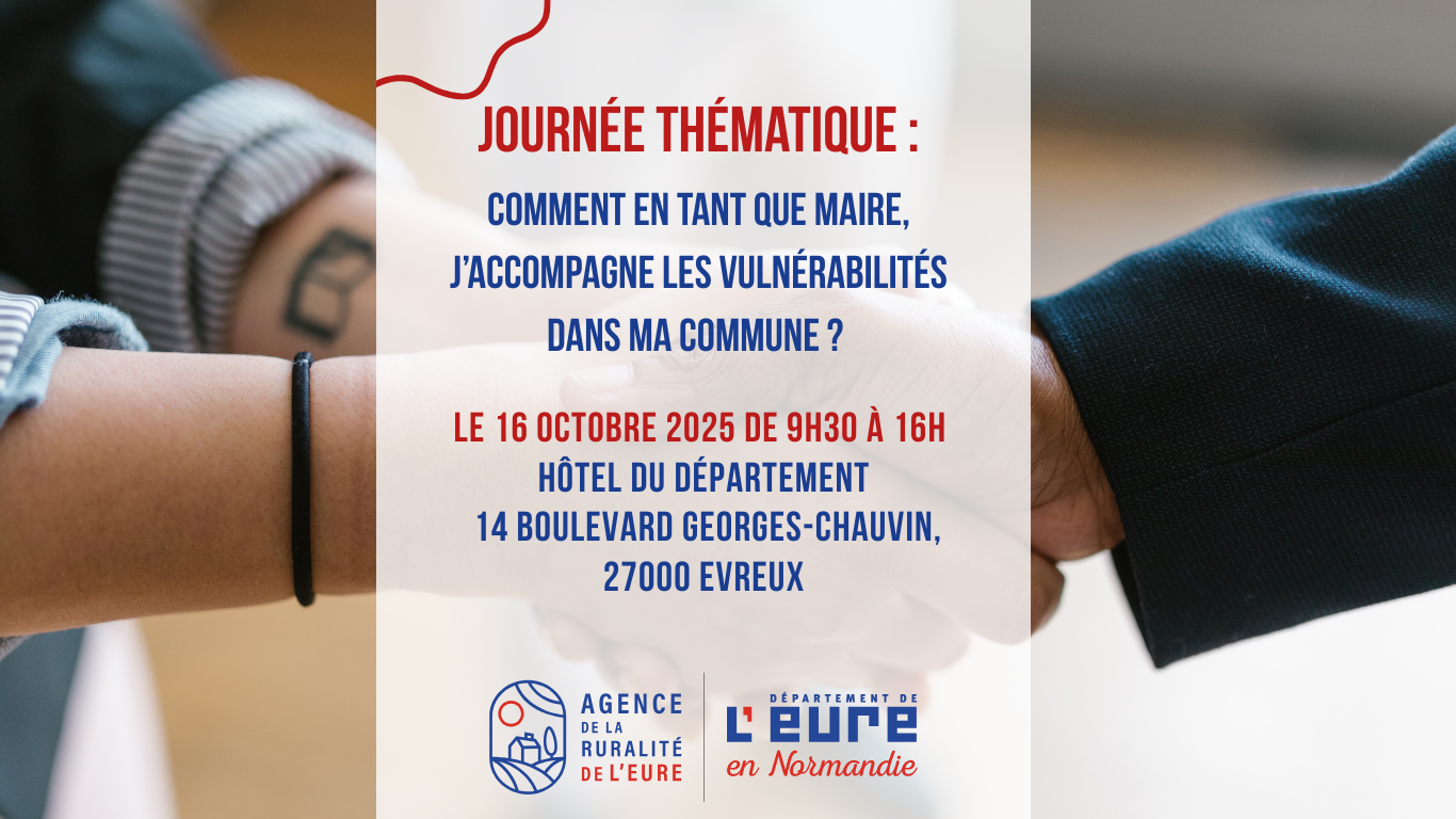 Vieillissement, isolement, accès aux soins, situations de fragilités … Les communes rurales de l’Eure sont en première ligne face aux vulnérabilités de leurs habitants. Pour accompagner au mieux ces réalités, L’Agence de la Ruralité et le Département de l’Eure invitent les élus à une journée thématique ce jeudi 16 octobre 2025 :